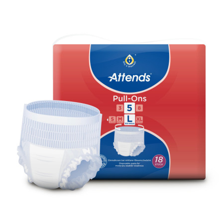 Attends Pull-Ons est une gamme de sous-vêtements jetables absorbants qui s’utilisent comme une culotte normale et qui sont conçues pour gérer l’incontinence modérée à sévère urinaire et/ou fécale.